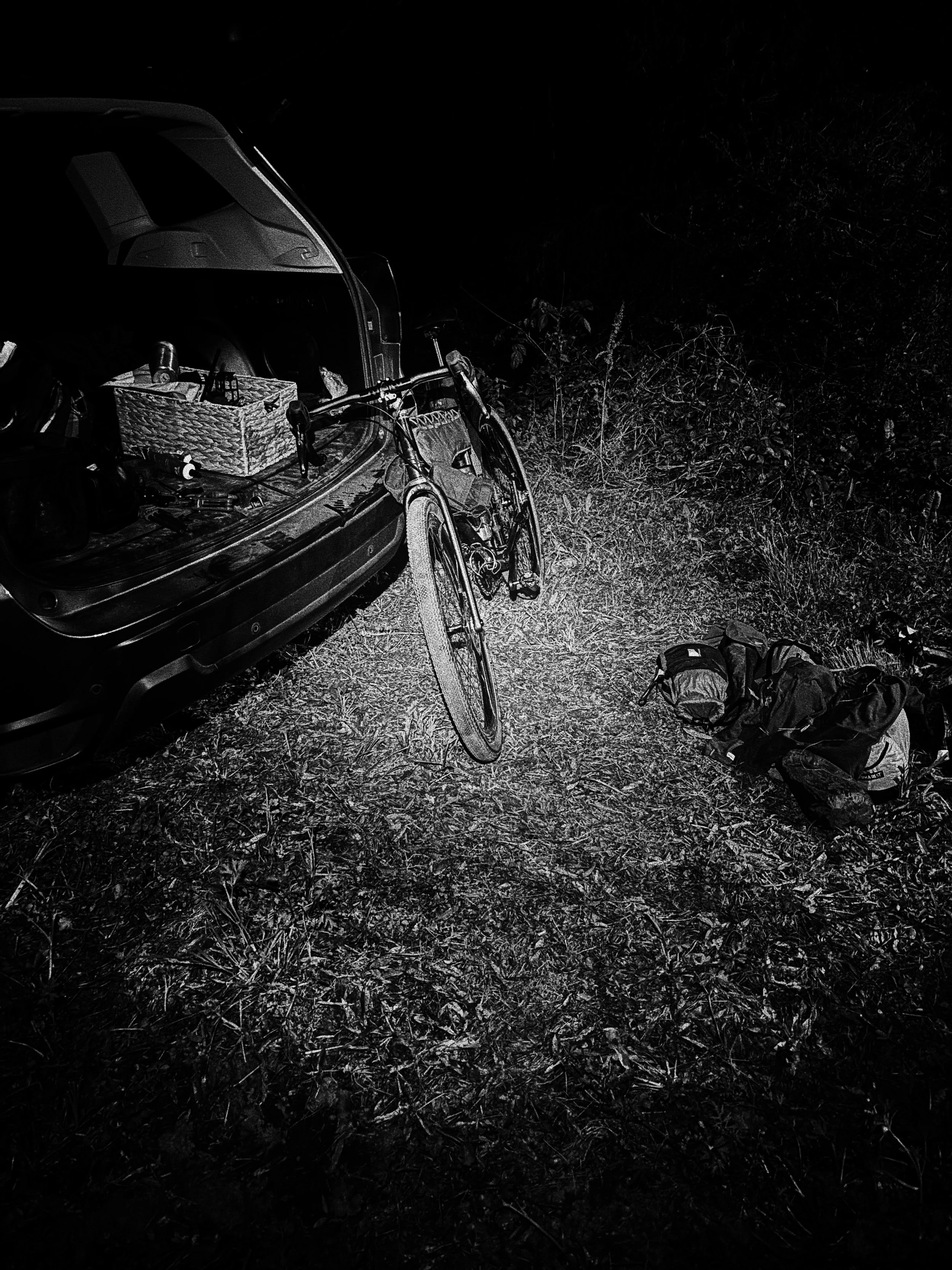 On our ride WhatsApp group, I’d seen that someone was already there camping, so I assumed people were trickling in slowly to the base camp. When I finally got to the Bullet Grill at 10pm, there wasn’t a human in sight. I unloaded stuff sacks and dry bags on the ground in the dark and completely reorganized my gear setup I’d gone through in my head 100 times the week prior.